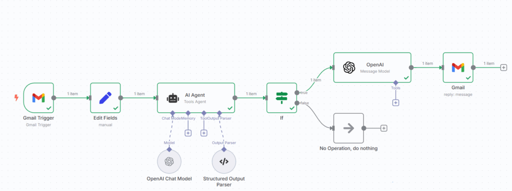 Finalmente, el nodo Gmail responde directamente al correo original: