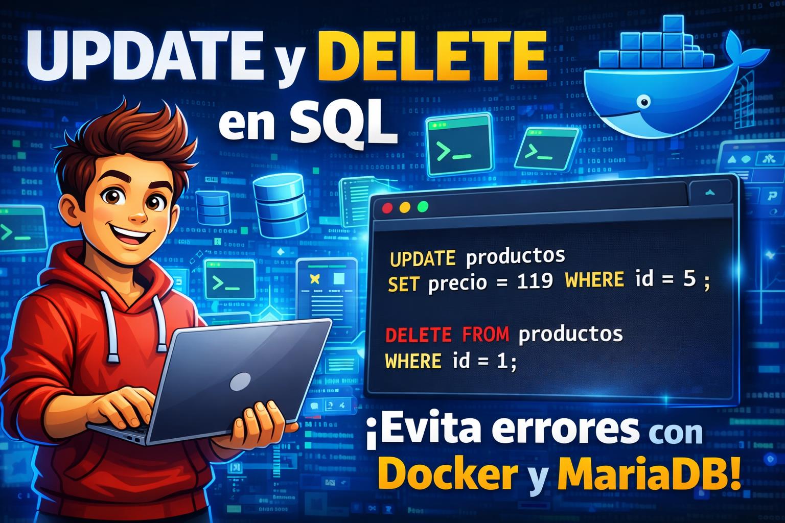 ¿Estás aprendiendo SQL y quieres asegurarte de no romper tu base de datos al hacer modificaciones? En este artículo, basado en una clase práctica del módulo de ofimática del ciclo formativo de grado medio en Sistemas Microinformáticos y Redes, aprenderás paso a paso cómo trabajar con comandos UPDATE y DELETE en bases de datos MariaDB dentro de contenedores Docker. Veremos ejemplos reales, errores comunes y cómo evitarlos. ¡Sigue leyendo y no olvides suscribirte al canal si este contenido te resulta útil!